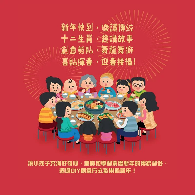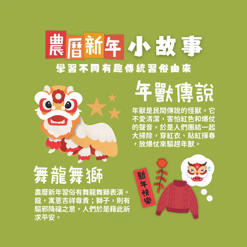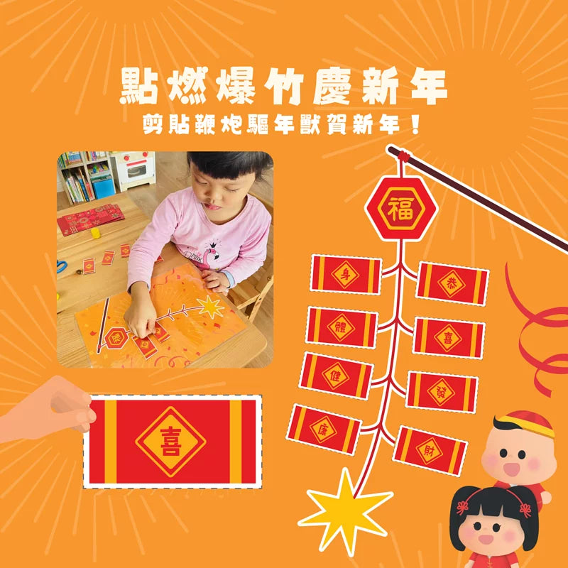 • 🐲6大新年主題包括新年小故事、舞龍舞獅、十二生肖、點燃爆竹、福子揮春、全盒糖果等