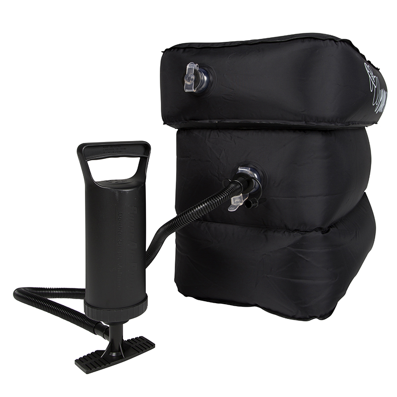 Ensure that the Plane Pal’s smaller (clear) valves are open. The larger (black) valves should be closed for inflation. They ensure the air cannot escape while you are inflating Plane Pal.